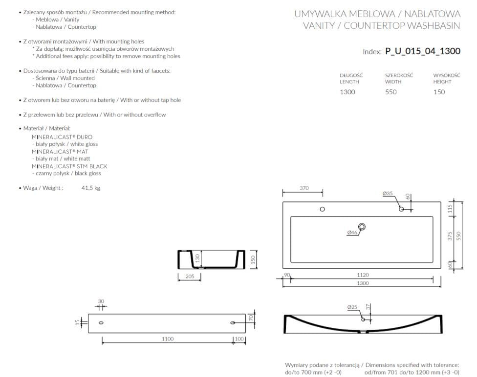 - wymiary: długość: 1300 mm, szerokość:550 mm, wysokość: 150 mm,
