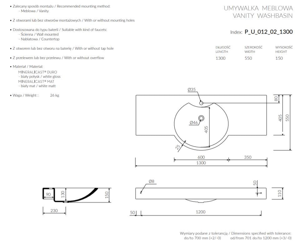 - kolor: biały połysk - (DUROCOAT® MATERIAL), możliwość zamówienia umywalki o strukturze biały mat - koszt obliczany indywidualnie,