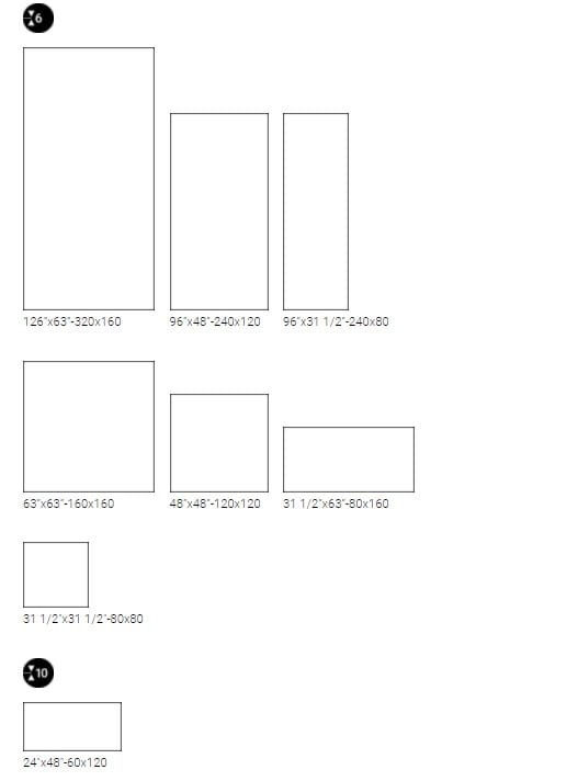 320x160 cm, 240x120 cm, 120x120 cm, 160x160 cm, 160x80 cm, 120x60 cm