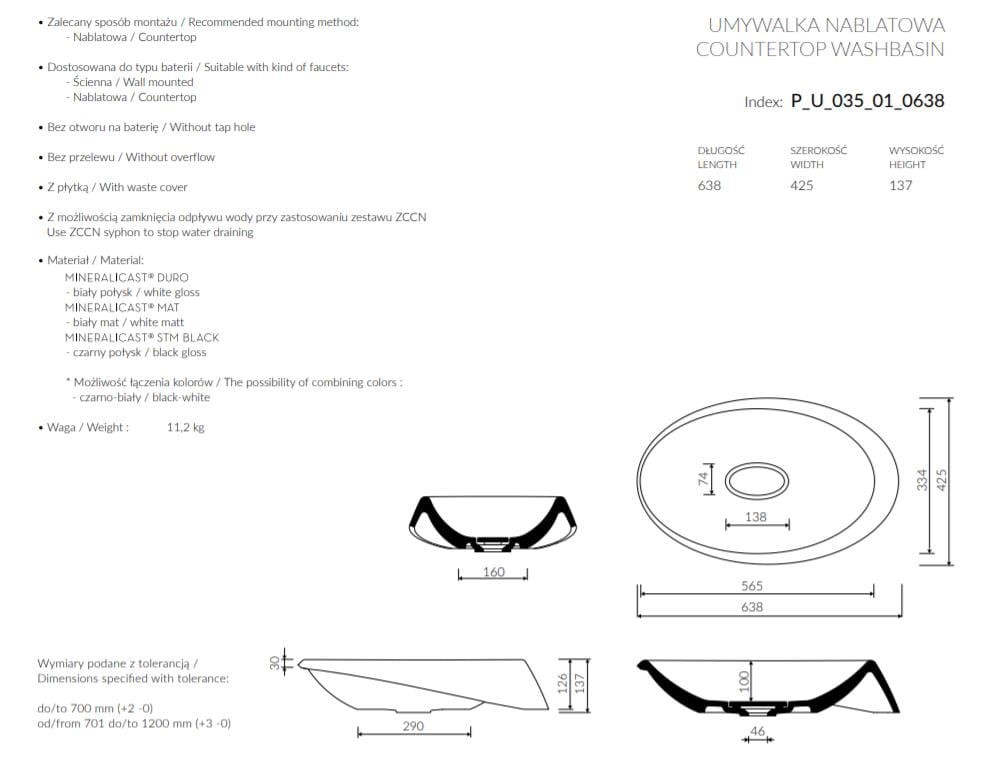 kolor: biały połysk - (DUROCOAT® MATERIAL), możliwość zamówienia umywalki o strukturze biały mat - koszt obliczany indywidualnie,