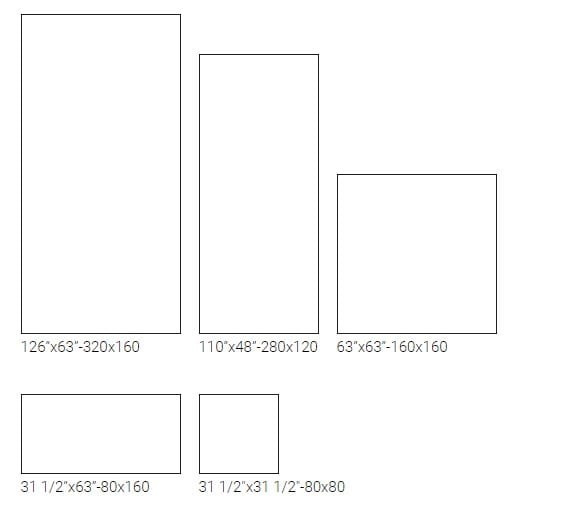 320x160 cm, 280x120 cm, 120x120 cm, 160x80 cm, 120x60 cm