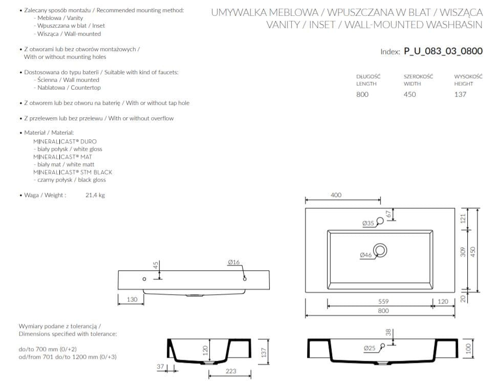 - wymiary: długość: 800 mm, szerokość:450 mm, wysokość: 137 mm,